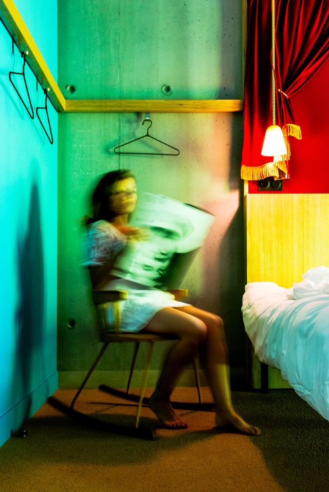 Dans un décor d’hôtel impersonnel, elle vacille. Assise, mais en mouvement. Présente, mais floue. Entre le turquoise froid du mur et le rouge chaud du rideau, son corps balance comme un souvenir incertain.